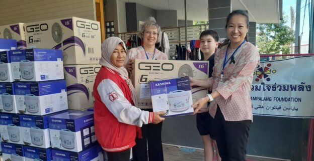 As the needs in the city were massive, relief efforts were limited and didn’t reach everyone. In many parts of the city, food packages were distributed. The chairperson of our foundation heard from local people in one area that they hadn’t received help yet. Some local people said that they needed electrical appliances as these had been damaged in the flood. Therefore, we gave out rice cookers and electrical fans to families in 3 communities. They really appreciated the help.